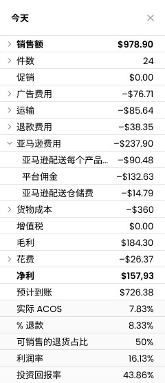 查看业务重要KPI的完整列表:销售额、销售单位、广告、运输和退款成本、亚马逊费用、商品销售成本、毛利和净利等。