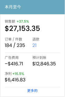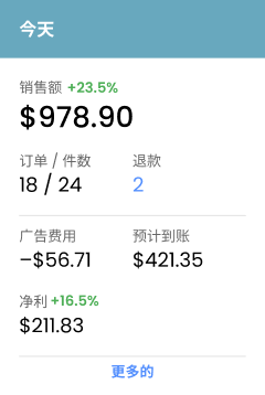 销售额、订单、退款、广告费、预计支付额、净利润一目了然,通过板块视图轻松进行业绩比较