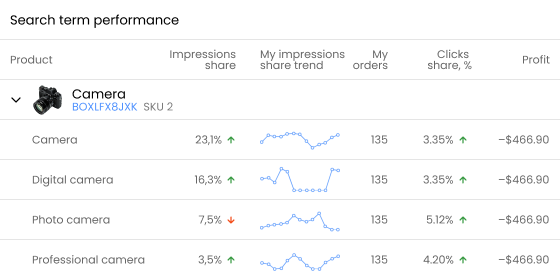 追踪特定关键词的市场份额趋势。发现竞争对手何时获得优势,或者你的份额下降,并基于数据做出 PPC 和商品列表决策。